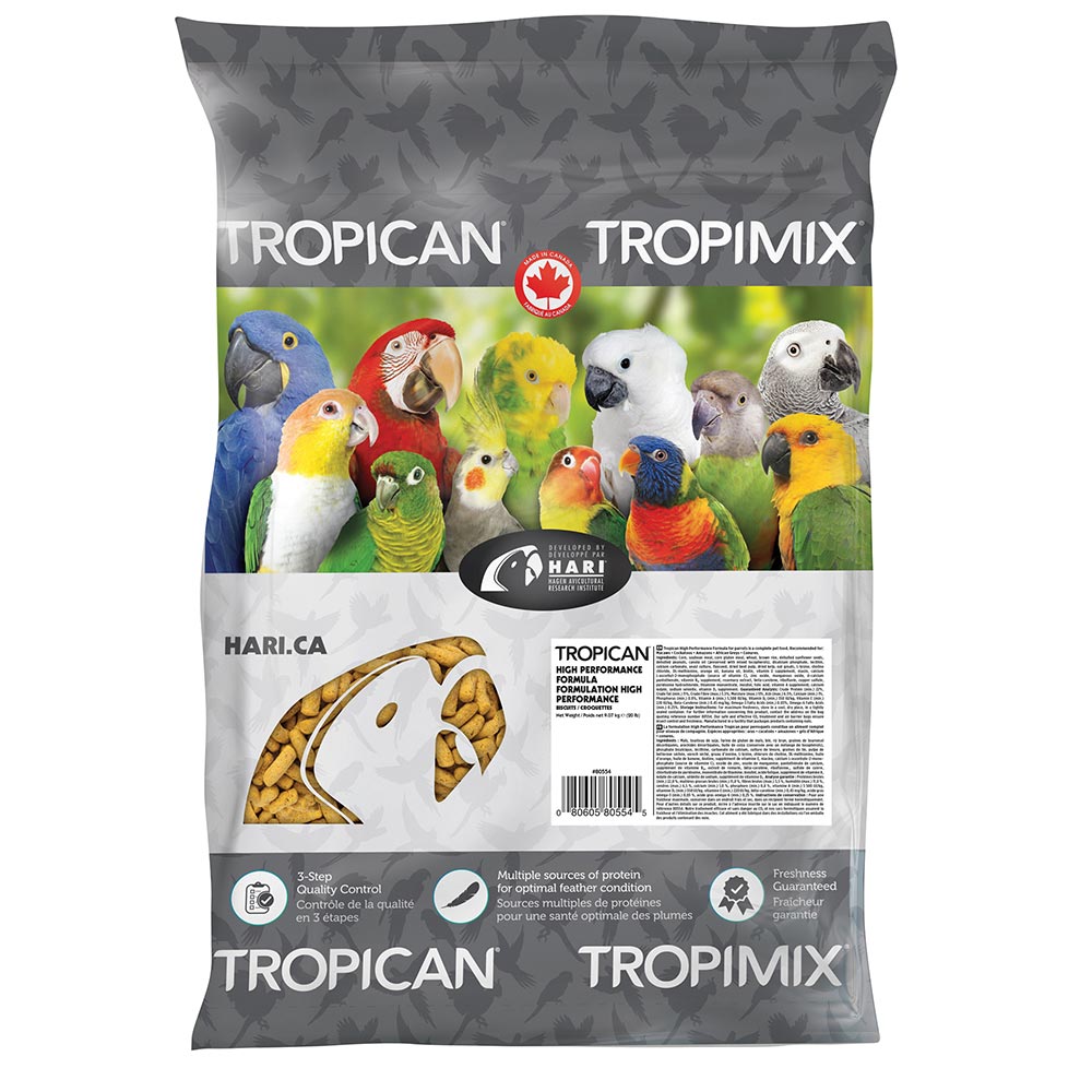 Puisque les aliments Tropican renferment vitamines et minéraux, l’utilisation de suppléments de vitamines n’est pas nécessaire. La formulation High Performance pour perroquets fournit une valeur calorique et un apport énergétique élevés aux oiseaux qui requièrent une alimentation très riche.